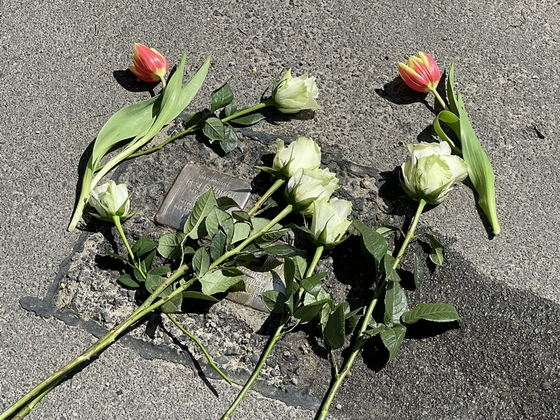 Das Aktionsbündnis "Weltoffenes Werder" hatte für den 08. Mai 2022, dem Tag der Befreiung, zum Gedenken an die Opfer des Nationalsozialismus eingeladen. Um 11:00 Uhr trafen sich ca. 30 Bürger*innen am Kreisverkehr Klaistower Str./Resi-Salomon-Straße in Glindow, um das neue Straßenschild im Gedenken an Resi Salomon einzuweihen. In einer Schweigeminute gedachten die Anwesenden den Millionen Opfern des Zweiten Weltkriegs. Nie wieder Krieg! Nie wieder Faschismus. Im Anschluss wurden Blumen an den Stolpersteinen für Resi und Hans Siegfried Salomon niedergelegt. Es wurde an die Schicksale der über hundert jüdischen Einwohner in Werder (Havel) in der Zeit der NS-Diktatur von 1933 bis 1945 gedacht. Als Teil der Erinnerungskultur in der Stadt erinnern weitere Stolpersteine an diese Schicksale.