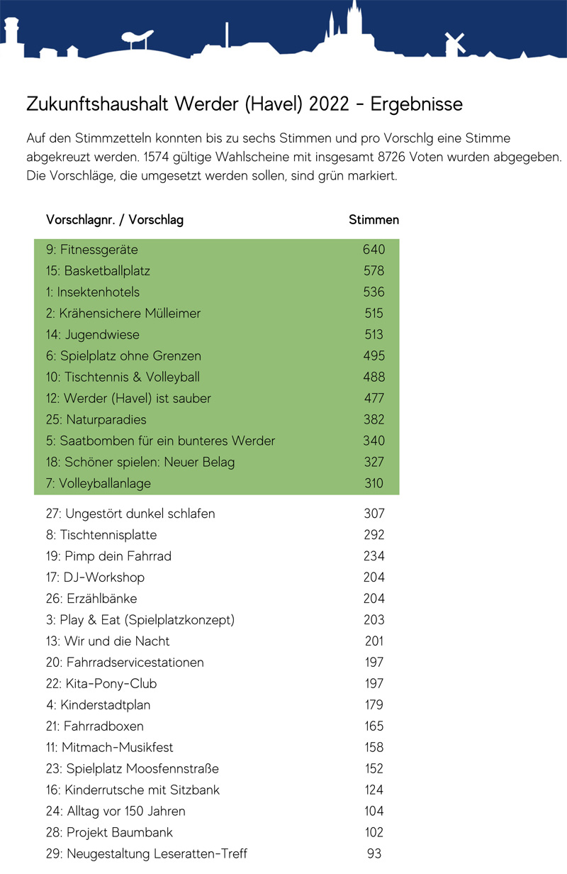 1574 Schüler haben sich an der Abstimmung über die Projekte beteiligt und dabei 8726 Stimmen vergeben. 29 Vorschläge, eingereicht im Frühjahr von Werderanern, standen auf den Stimmzetteln zur Auswahl. Beim zentralen Wahltag haben alle großen Schulen in Werder (Havel) mitgemacht, wodurch eine hohe Wahlbeteiligung erreicht werden konnte.