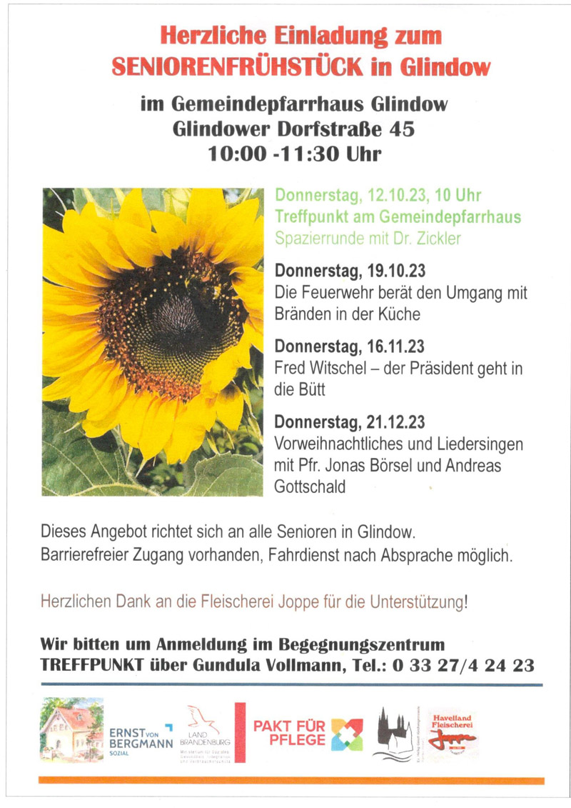 Dieses Angebot richtet sich an alle Senioren in Glindow. Barrierefreier Zugang vorhanden, Fahrdienst nach Absprache möglich.