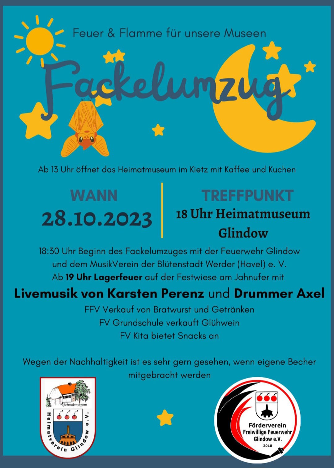 Am 28.10. beteiligt sich der Heimatverein wieder am Aktionstag "Feuer und Flamme für unsere Museen". Er lädt ein in das Heimatmuseum Glindow, im Kietz 3. Unterstützt wird der Heimatverein vom Förderverein Freiwillige Feuerwehr Glindow e. V. und der Freiwilligen Feuerwehr Glindow sowie den Fördervereinen der Grundschule Glindow und der KITA Regenbogen.