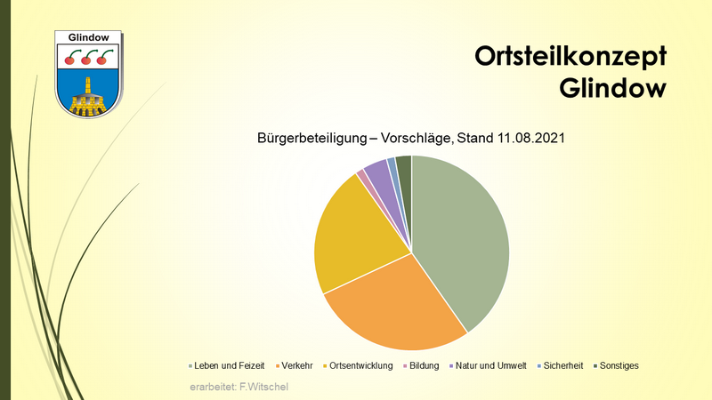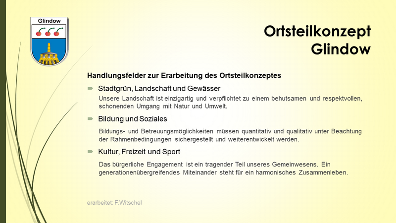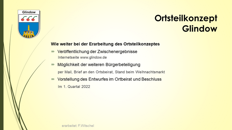 Noch immer gibt es die Möglichkeit, seine Vorschläge und Ideen per E-Mail an info@glindow.de oder mit der Post an den Ortsbeirat zu senden. Spätestens im 1. Quartal 2022 soll die finale Fassung des Konzeptes vorliegen.