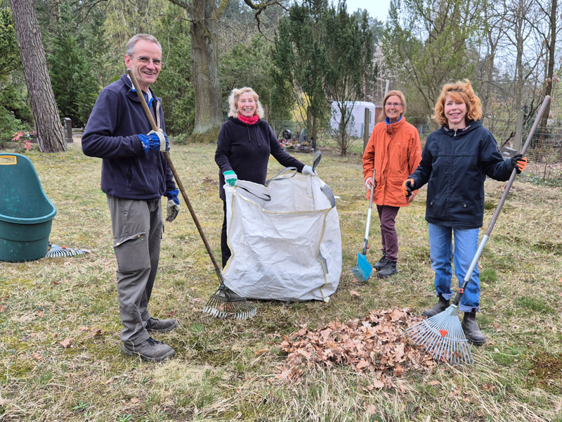 Rund 25 freiwillige Helferinnen und Helfer, die vom stellvertretenden Vereinsvorsitzenden Andre Milano und von Pfarrer Dr. Andreas Uecker begrüßt wurden, beteiligten sich am 12. April daran. Es wurde gesammelt, sortiert, geharkt und gekratzt. Firma Gieske hatte wieder einen Container bereitgestellt, Firma Thomas Giese unterstützte das Beladen mit dem Radlader und um die Entsorgung kümmert sich der Bauhof der Stadt Werder. Im Vorfeld hatte schon Aron Giese als Helfer vorbereitende Arbeiten mit jugendlichem Elan erledigt. Nach Beendigung der Aktion versammelten sich alle Beteiligten auf dem Platz vor der Trauerhalle, wo der Pfarrer und ein Mitglied der Kirchengemeinde zum gemeinsamen, leckeren Frühstück einluden. Der Vormittag klang in fröhlicher Stimmung und mit netten Gesprächen aus.