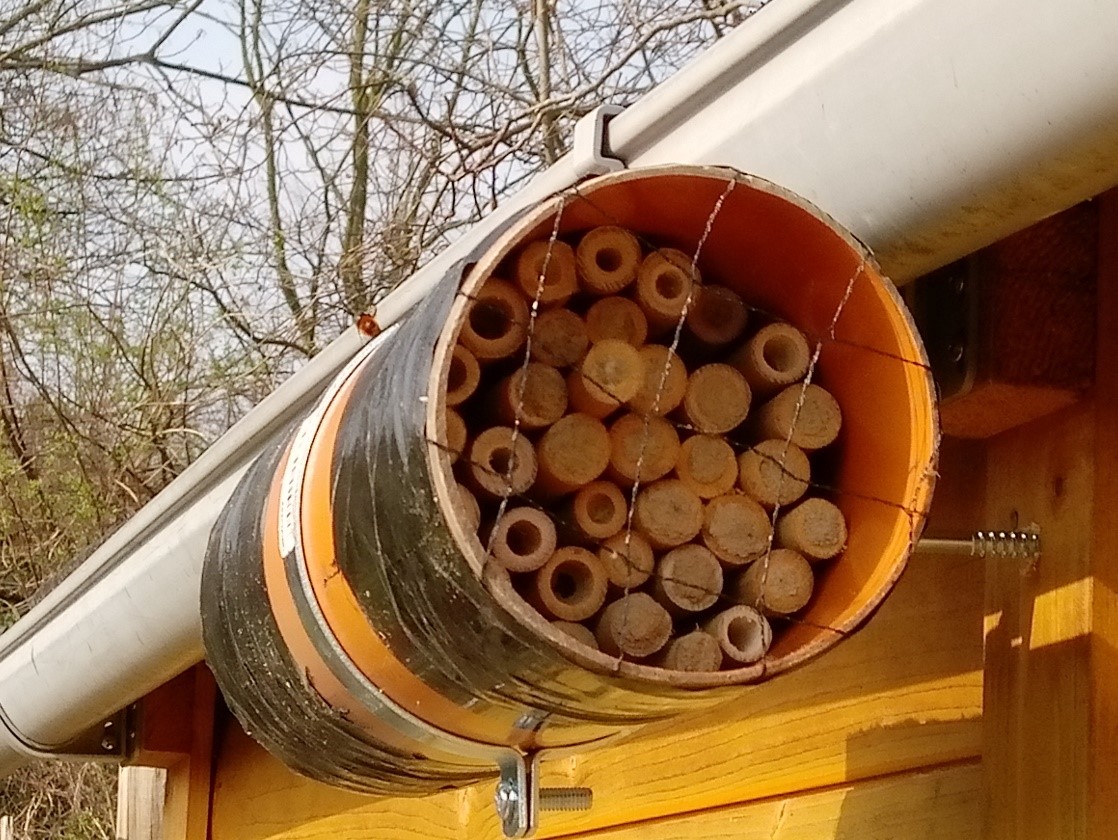 Die Wildbienen sind bereits da: Eine Startpopulation der Mauerbienen wartet oberhalb des Insektenhotels schon auf den Frühling.