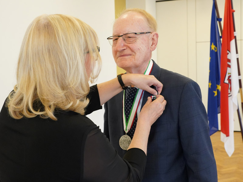 Manuela Saß verleiht Sigmar Wilhelm die Silberne Ehrenmedaille (Foto: Stadt Werder/Havel, hkx)