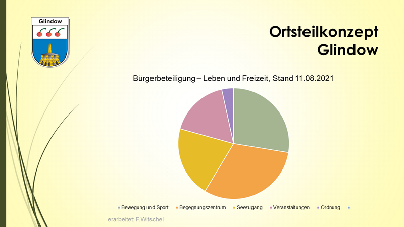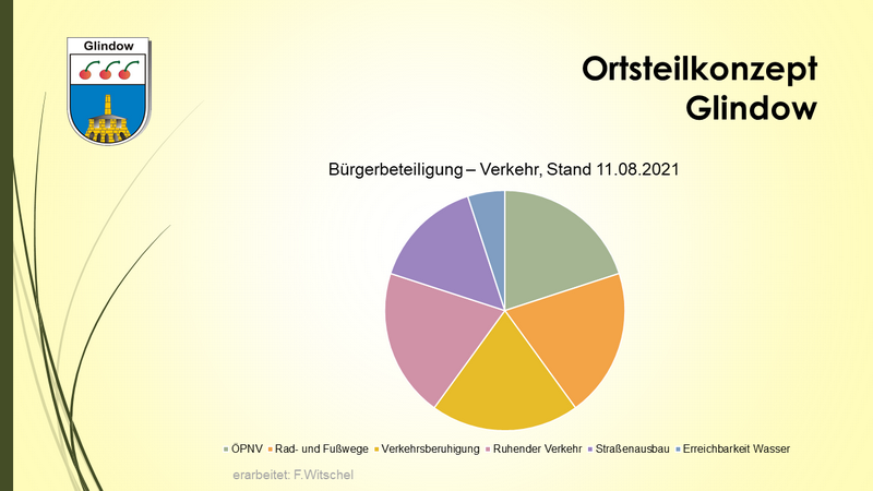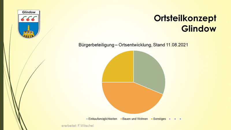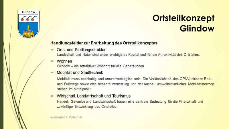 Noch immer gibt es die Möglichkeit, seine Vorschläge und Ideen per E-Mail an info@glindow.de oder mit der Post an den Ortsbeirat zu senden. Spätestens im 1. Quartal 2022 soll die finale Fassung des Konzeptes vorliegen.